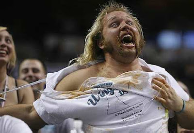 Competitor Douglas Perok "Obi Wing", rips his shirt after vomiting to lose at "Wingbowl 18", the annual chicken wing eating contest in Philadelphia, Pennsylvania, February 5, 2010. About 18,000 people turned out before dawn on Friday for the 18th Wing Bowl, an eating competition dubbed the world's biggest, and an annual celebration of Philadelphia's raucous sports-crazed culture. Each competitor was attended by a posse of wingettes, scantily clad young women who fetched the wings and mopped the brows of the contestants to the delight of the overwhelmingly male crowd.