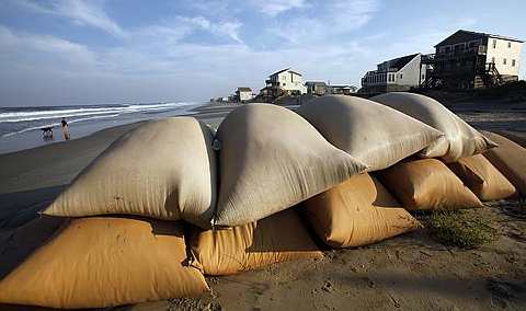 Chase Woolridge, from left, Whit Lombardo, Tyler Woolridge, and Jennifer Magner climb on sand bags along the southern beach in Nags Head, N.C., Wednesday, Sept. 1, 2010. Hurricane Earl continues to make it's way towards North Carolina's Outer Banks