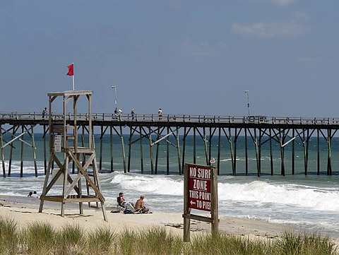 A few fishermen try their luck from the pier while sunbathers watch the waves roll in at Kure Beach, N.C., on Wednesday, Sept. 1, 2010. Powerful Hurricane Earl spun toward the East Coast on Wednesday, driving tourists from North Carolina's vacation islands and threatening to bring damaging winds and waves to the Atlantic seaboard through Labor Day weekend