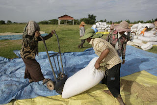 Villagers dry their rice under sunlight at a rice farm during the harvest at Kork Banteay village, Kandal province, some 30 kilometers (18 miles) east of Phnom Penh, Cambodia, Friday, June 22, 2012.