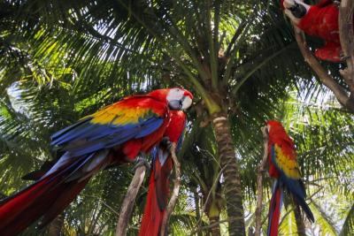 Scarlet macaws (Ara macaw) sit on a palm tree at Xcaret park, in the Mayan Riviera, near Playa del Carmen city, Mexico on April 25, 2013. The Xcaret park broke the Guinness Record for having 132 Scarlet macaws --a pecies in danger of extinction-- born in the same place