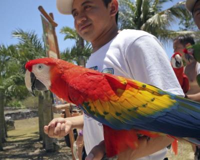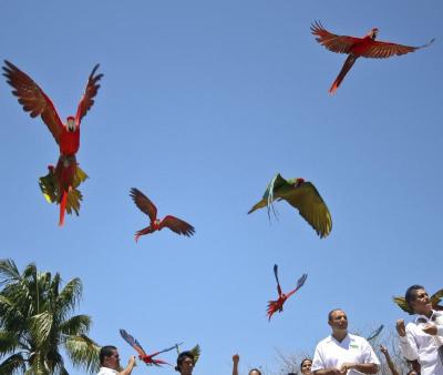 Hundreds of Scarlet macaws (Ara macaw) are released at Xcaret park, in the Mayan Riviera, near Playa del Carmen city, Mexico on April 25, 2013. The Xcaret park broke the Guinness Record for having 132 Scarlet macaws --a pecies in danger of extinction-- born in the same place