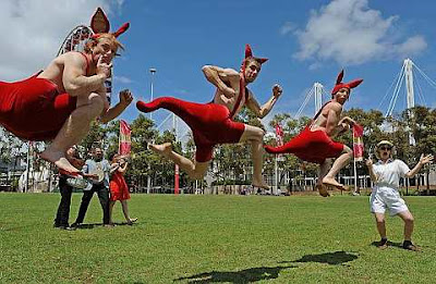 Performers from the internationally acclaimed Australian Circus Oz masquerading as kangaroos, Jeremy Davies and Paul O'Keeffe (top), perform during a media call at Tumbalong Park in Sydney on December 1, 2009. Circus Oz will bring their show "Barely Contained" to Sydney in January 2010 to entertain with a blend of acrobatic performances and comedic mayhem.