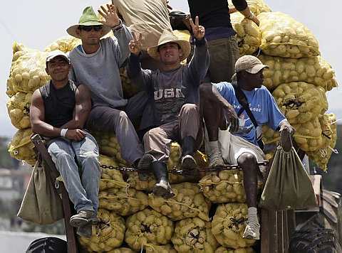 Workers salute from a cart pulled by a tractor carrying sacks of potaoes on the outskirts of Santa Clara, province of Villaclara in central Cuba, around 280 kilometres (175 miles) from Havana, April 6, 2010.