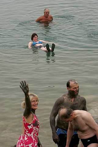 Tourists cover their bodies with black mud on the beach of Jordan's side of the Dead Sea April 11, 2010. A growing number of medical patients and visitors are flocking to Jordan's Dead Sea for its black mud, which is thought to possess healing properties that can treat skin diseases.