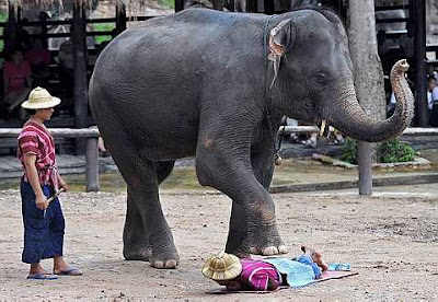 An elephant prepares to massage a mahout while performing for tourists at Mae Sa elephant camp in Chiang Mai province on August 3, 2010