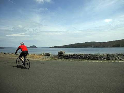 This April 24, 2011 photo shows a biker riding past the Goodnough Dike around the Quabbin Reservoir in Ware, Massachusetts, which is sometimes described as an "accidental wilderness."