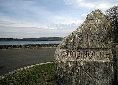 This photo April 23, 2011 photo shows a stone marker for the Goodnough Dike, built during the construction of the Quabbin Reservoir in Ware, Mass. Four towns were moved to make way for the reservoir, which supplies water to more than 2 million people in 51 communities, and its watershed area is now a park