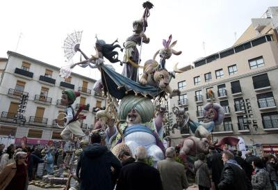 View of a Falla, a gigantic sculpted satirical structure made of cardboard, taken during preparations for the Fallas Festival ,on March 14, 2013 in Valencia. The Fallas will be burned in the streets of Valencia on March 19, 2013, as a tribute to St Joseph, patron saint of the carpenters' guild