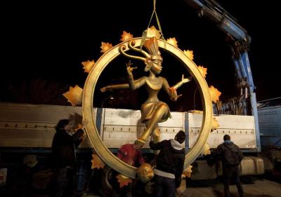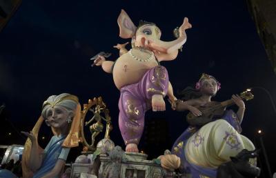 A picture taken on March 19, 2013 shows a Falla, a gigantic sculpted structure of cardboard and wood which humorously portrays relevant current events and personalities, caricaturing elephant-headed Hindu god Lord Ganesha in Valencia. This Falla was dismantled after a man tried to immolate himself in front of the structure. The Fallas will be burned in the streets of Valencia today, as a tribute to St Joseph, patron saint of the carpenters' guild.