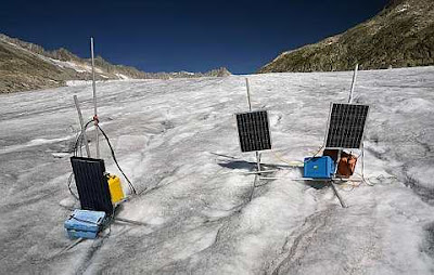 Measurement instruments installed by students of the Federal Institute of Technology in Zurich (EPFZ) are pictured on the Rhone glacier at Furka in this September 9, 2009 file photo. From the Himalayas to the Andes, faster-melting glaciers spell short-term opportunities -- and long-term risks -- for hydroelectric power and the engineering and construction industries it drives. The most widely used form of renewable energy globally, hydro meets more than half Switzerland's energy needs. As summers dry and glaciers that help drive turbines with meltwater recede, that share may eventually fall. Picture taken September 9, 2009