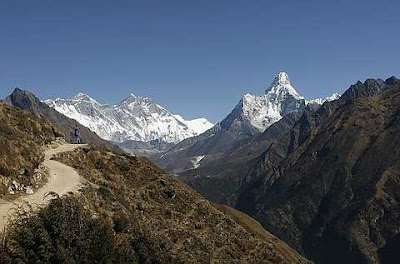 A tourist (L) looks at a view of Mount Everest from the hills of Syangboche in Nepal December 3, 2009. Nepal's cabinet plans to meet on Friday at the base camp of Mount Everest to highlight the impact of global warming on the Himalayas.