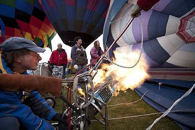 Pilot Cliff Keller inflates his balloon with hot air before takeoff at the start of the Albuquerque International Balloon Fiesta in Albuquerque, New Mexico, October 3, 2009