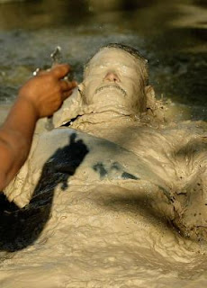 A believer asking "Nino Fidencio" for a miracle is helped to submerge in the mud at "El Pozito" in El Espinazo, Monterrey, Nuevo Leon state, on March 19, 2012