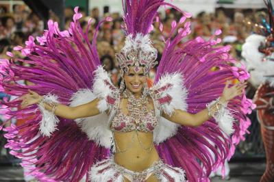 A reveller of Porto da Pedra samba school dances during the first night of carnival parade at the Sambadrome in Rio de Janeiro on February 20, 2012