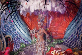 A nomine for Queen of the Santa Cruz carnival shows off her outfit under the watchful eyes of the jury at Santa Cruz de Tenerife on the Spanish Canary island of Tenerife, February 15, 2012.