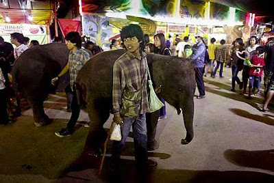 A Thai mahout with a baby elephant waits to sell sugar cane as feed for the animal at the 49th Surin Elephant Roundup in Surin, Thailand, Thursday, Nov. 19, 2009. The event brings together mahouts and elephants from all over Thailand. Once used for logging and transportation elephants today in Thailand have been replaced largely by cheap motorcycles and tractors.