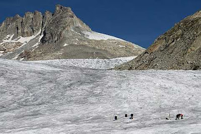 Measurement instruments installed by students of the Federal Institute of Technology in Zurich (EPFZ) are pictured on the Rhone glacier at Furka in this September 9, 2009 file photo. From the Himalayas to the Andes, faster-melting glaciers spell short-term opportunities -- and long-term risks -- for hydroelectric power and the engineering and construction industries it drives. The most widely used form of renewable energy globally, hydro meets more than half Switzerland's energy needs. As summers dry and glaciers that help drive turbines with meltwater recede, that share may eventually fall. Picture taken September 9, 2009