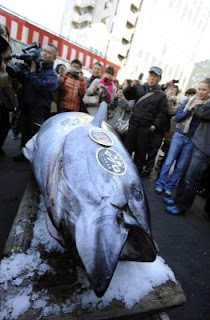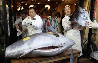 A 567,000 euros worth bluefin tuna is exposed near Tsukiji market in Tokyo, Japan, 05 January 2012. Kiyoshi Kimura, president of the company operating the Sushi-Zanmai chain, was the winning bidder of a 269-kilogram bluefin tuna which was sold for a record 56.49 million yen (about 567,000 euros) at the first auction of the year at Tokyo's Tsukiji fish market