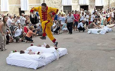 A man dressed in a red and yellow costume representing the devil, known as El Colacho, jumps over babies placed on a mattress during traditional Corpus Christi celebrations in Castrillo de Murcia, near Burgos, northern Spain June 26, 2011. The northern Spanish town has for centuries chosen to protect its young from evil spirits with the unusual ritual in which a man dressed as the devil leaps over mattresses each holding four or five babies.